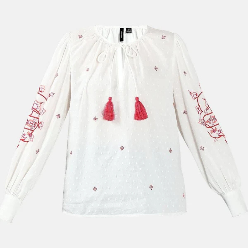 Effortlessly chic, this white top features delicate red embroidery, a front tie-up with playful red tassels, and full sleeves with gathered cuffs. Designed for a relaxed fit, it gracefully falls over the hips—perfect for an easy yet stylish look.